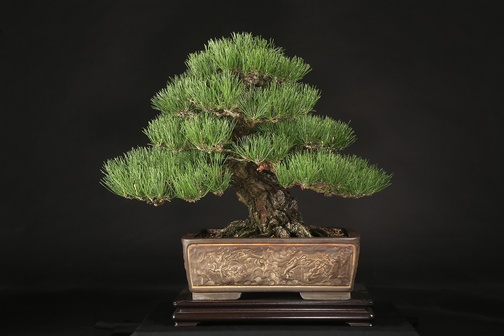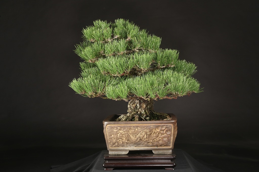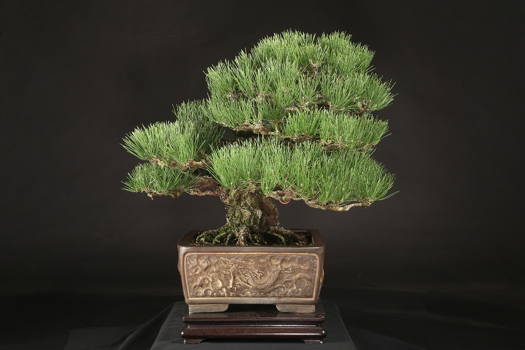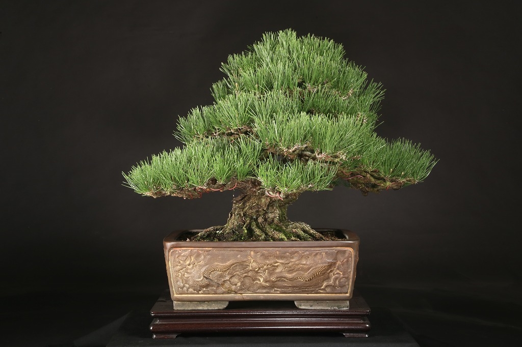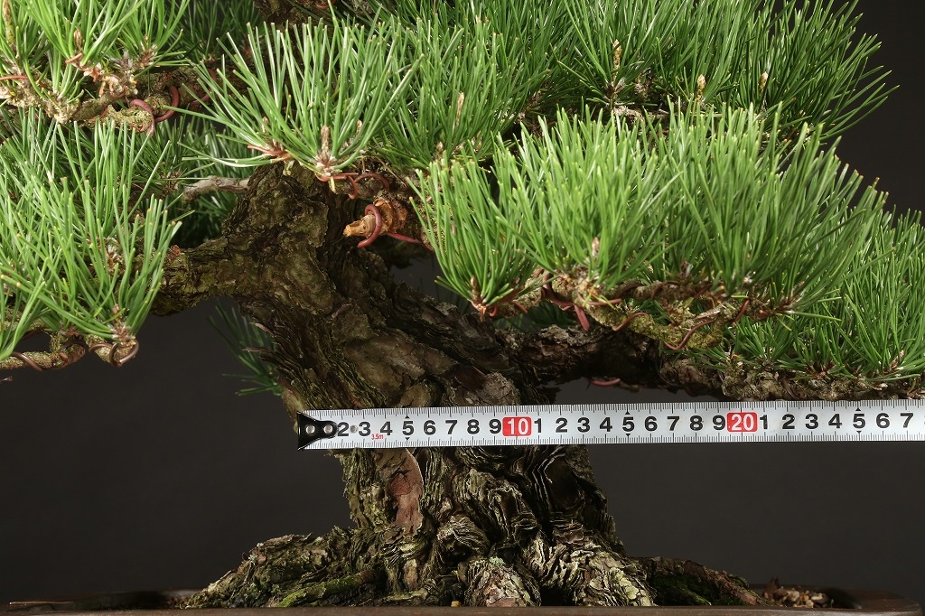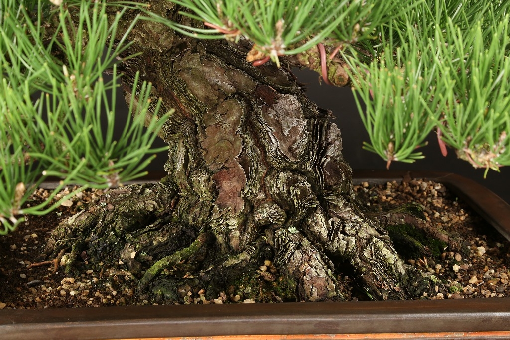 力強い根張り、黒松の理想的は幹肌の素晴らしさ!盆中で若木の頃より丹精を尽くした足跡が、幹模様や根張り、枝配りに感じられます。