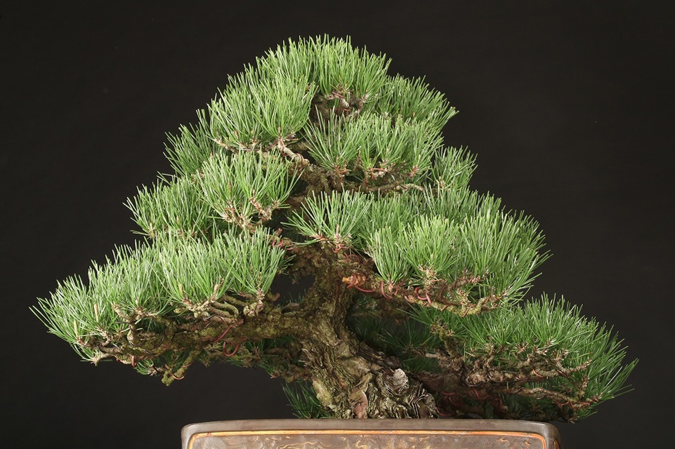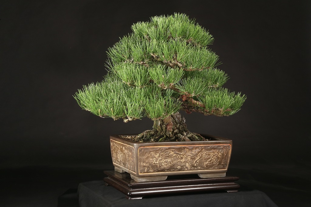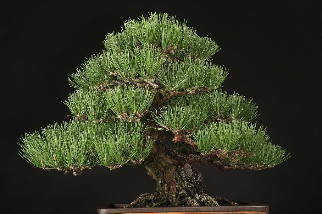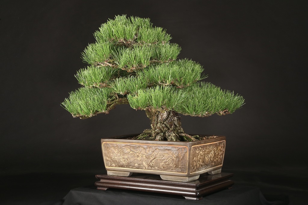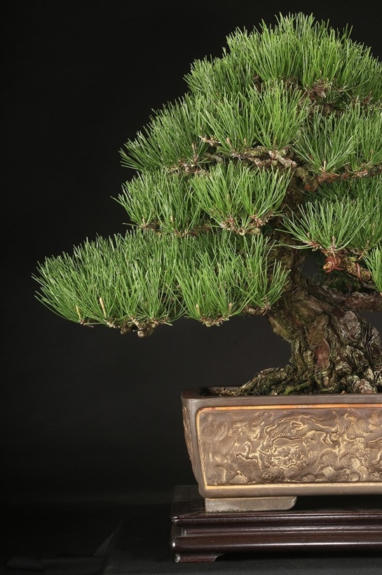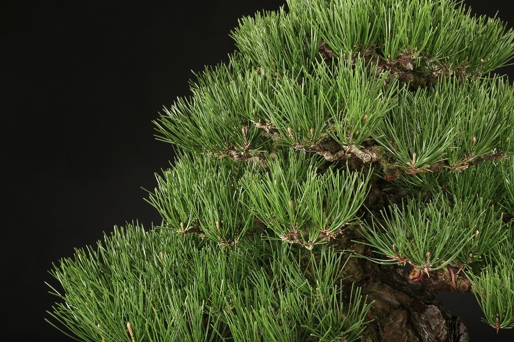 力強い根張り、黒松の理想的は幹肌の素晴らしさ!盆中で若木の頃より丹精を尽くした足跡が、幹模様や根張り、枝配りに感じられます。