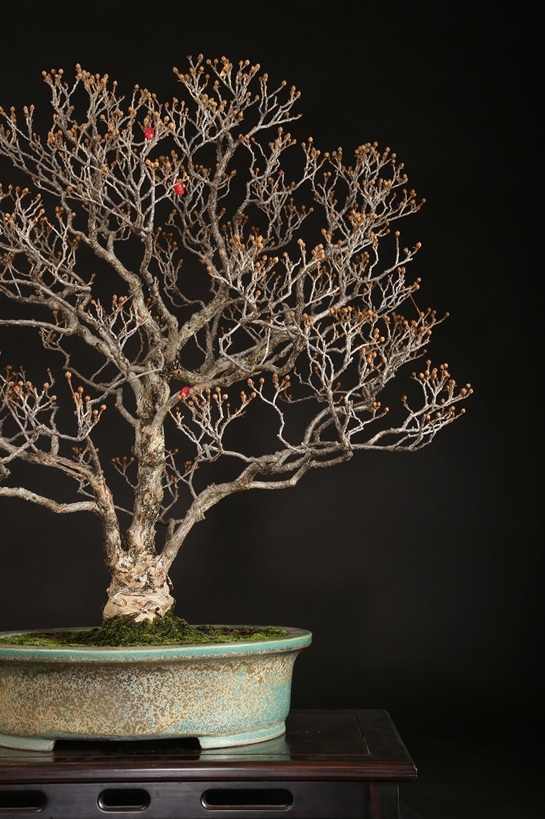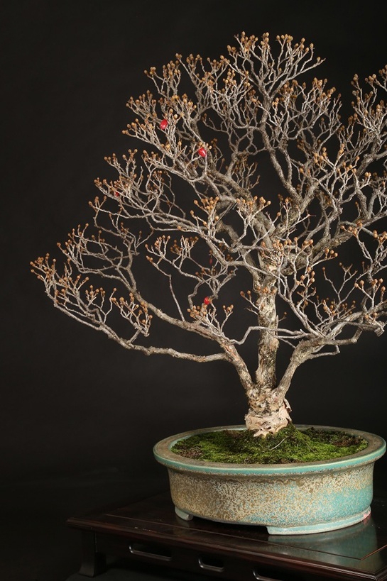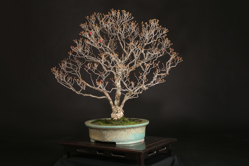 春の訪れを知らせる黄色の愛らしい花々、秋には真紅の美しい実色を楽しませてくれるサンシュユ。この樹のように、大きな疵を持たずに枝先まで柔らかな姿を持つものは大変少なく、花物盆栽として持込みの古い雅盆と言えます。春の植替えで、この鴻陽鉢からやや薄手で広がりのある鉢に入れ替えることで、樹相は更に向上します。