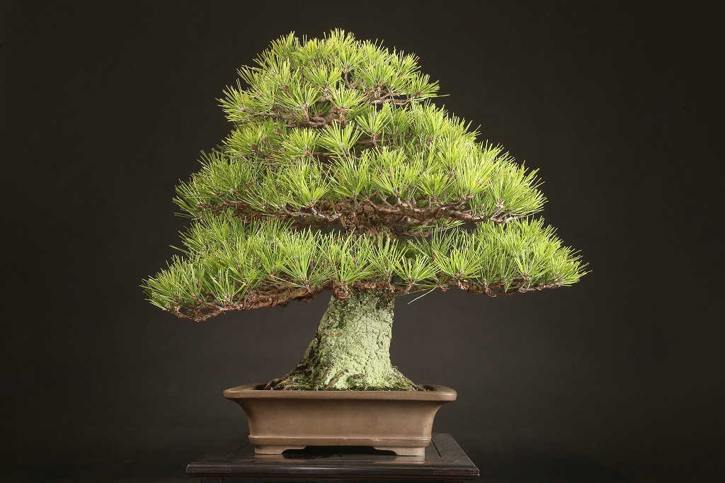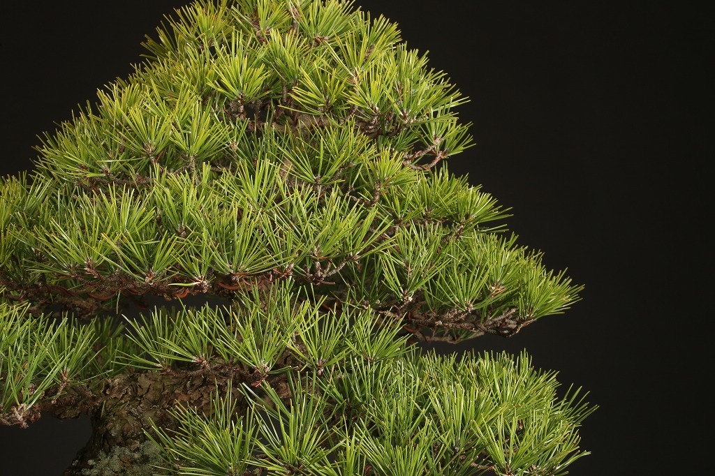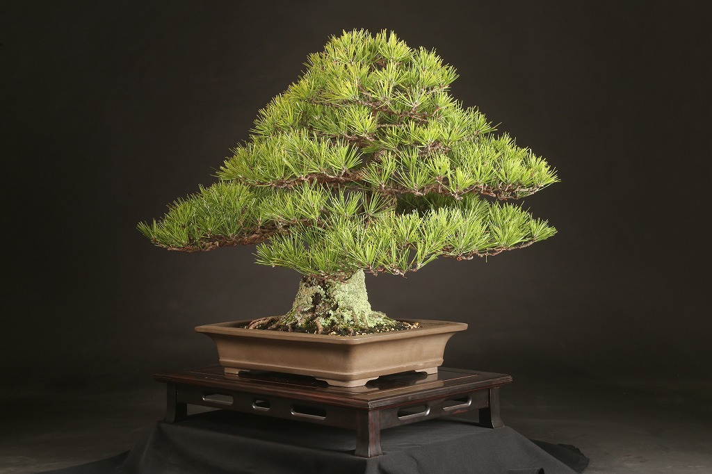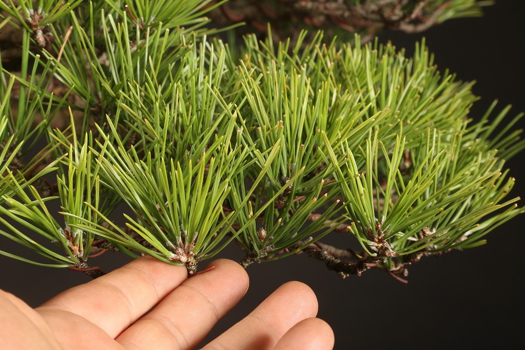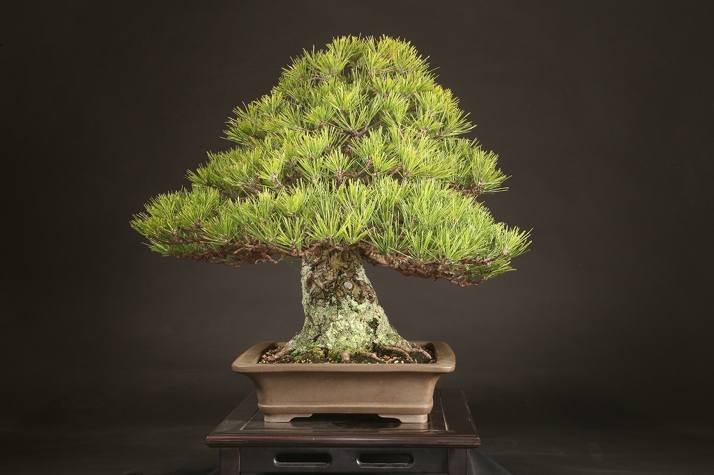 細身の頃より丹精を重ねて作出された、ごまかしのない美しい黒松です。幹味・枝配りの緻密さ、根張りの状態からも、ここからの数年の培養で、国風展中品黒松の秀樹が仕上がります。疵気ない鉢作りの古作をご紹介します。
