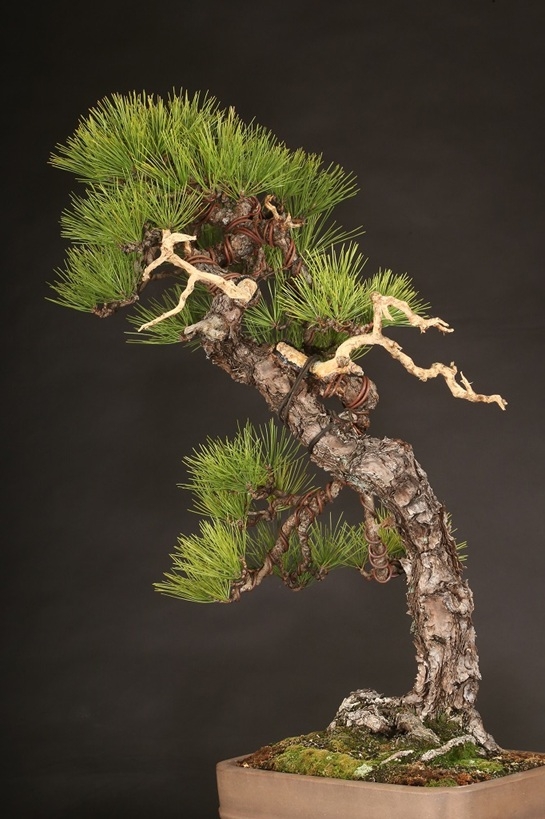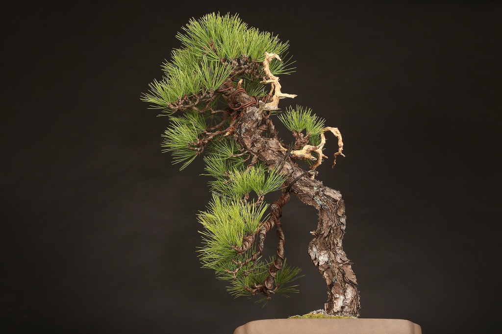幹古く、揺れたつ天然の幹芸は絶品です。無駄枝の捌き直しを経て、食い付き調子の文人調の雅盆へ生まれ変わったこの樹は、ここからの鉢映りの一考や、枝々の経年による古感などで、見違える価値観へと変貌を遂げる逸材と言えます。