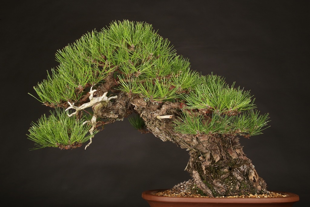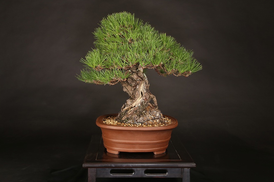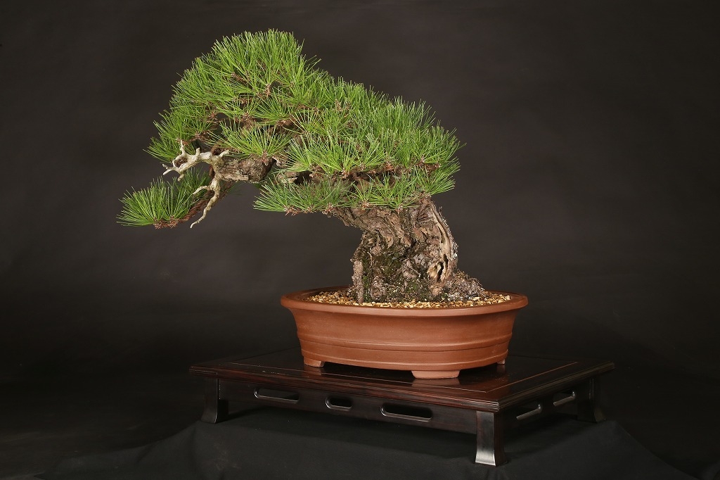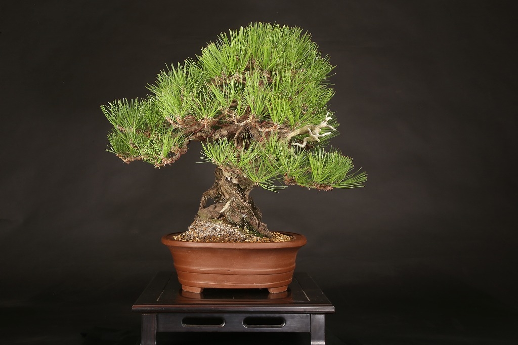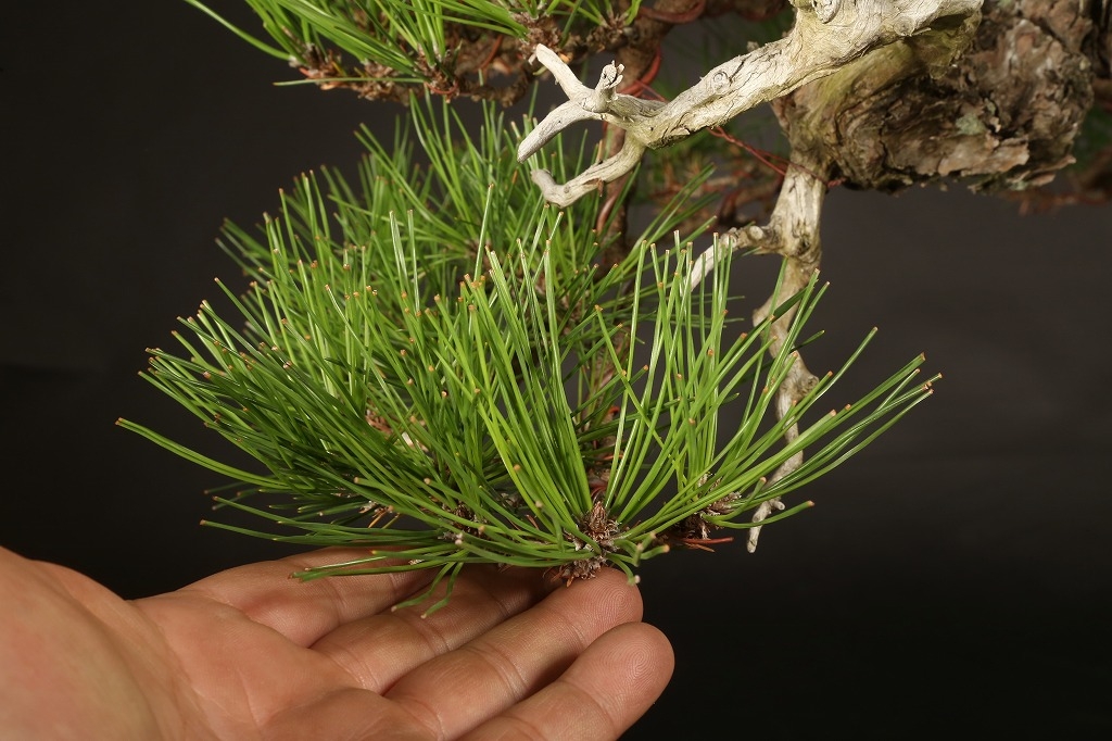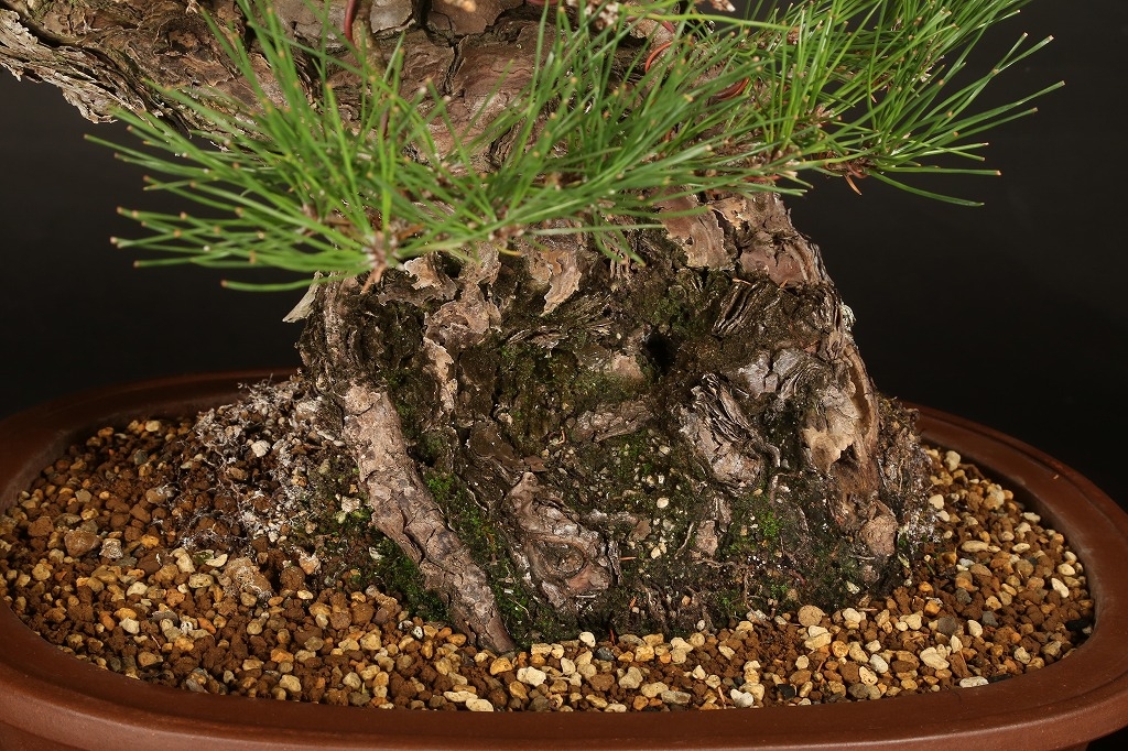 太幹中品ながら、黒松には珍しい“流れ“を幹模様に見せる逸材です。鉢持込み古く、幹肌は既に老幹としての雅味を現しています。出品前に森山義彦師による針金施術と鉢合せの植替えを済ませてのご紹介です。