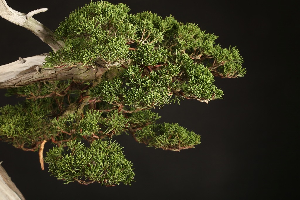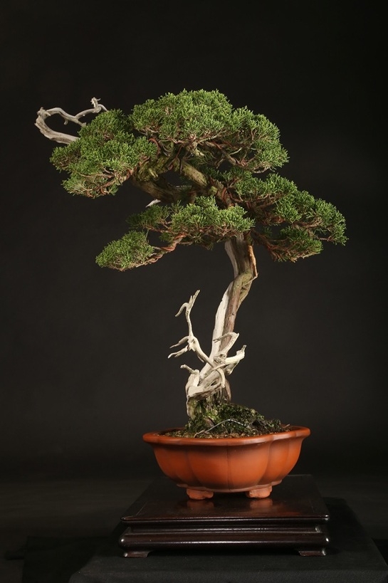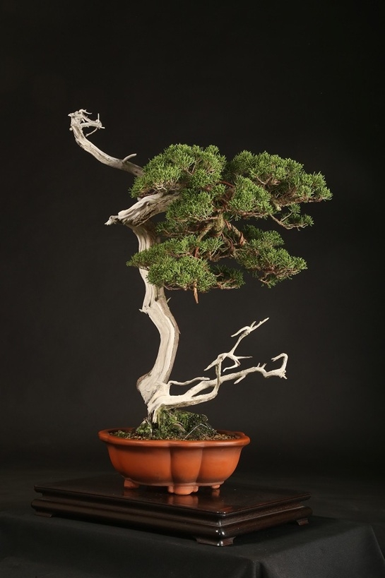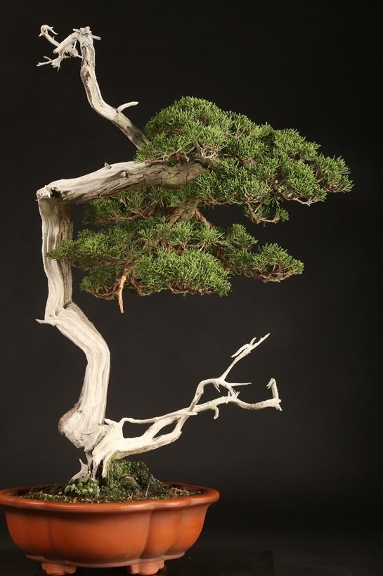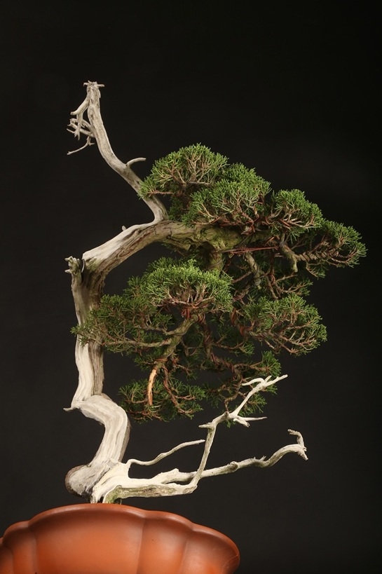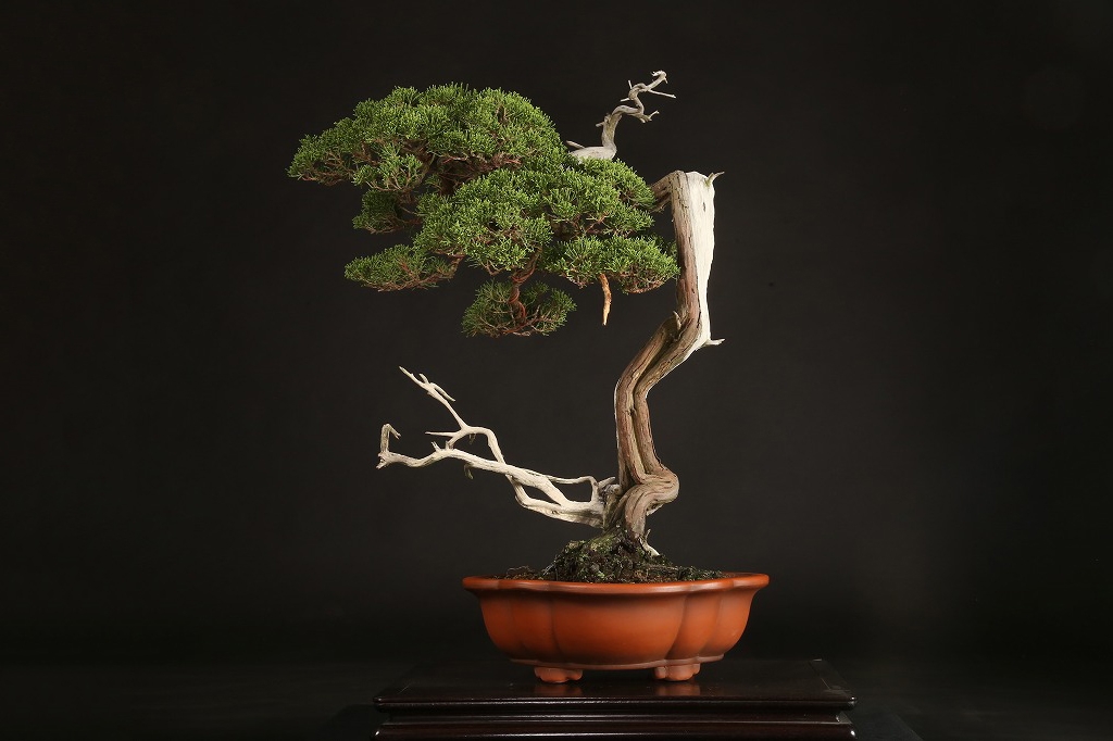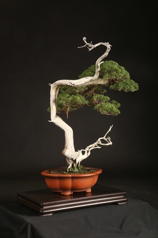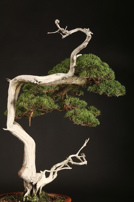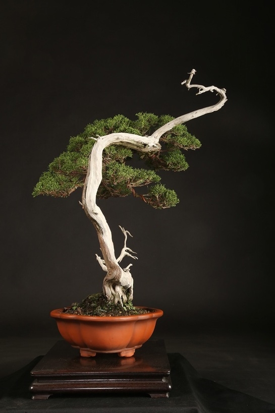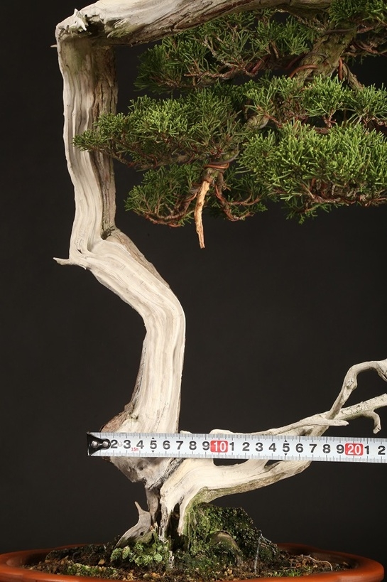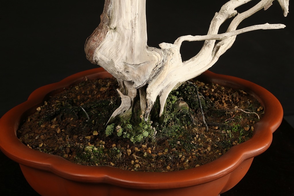 空間の美を持ち、舎利となった子幹と天部、ある意味モダンなデザイン的盆栽と言える作品です。斬新な鉢合わせをする事で、次元の異なる価値観が生まれる可能性高い一樹です。