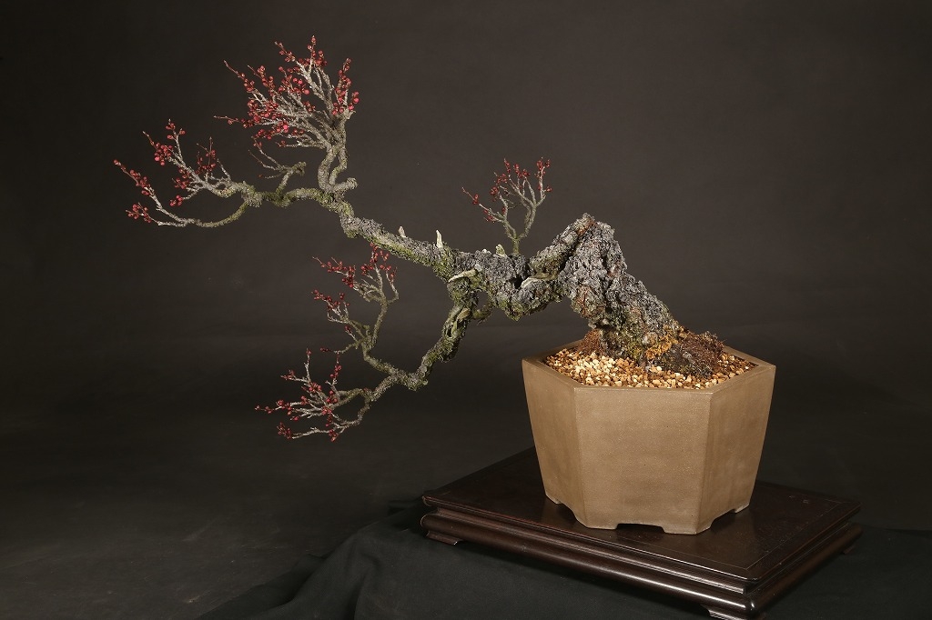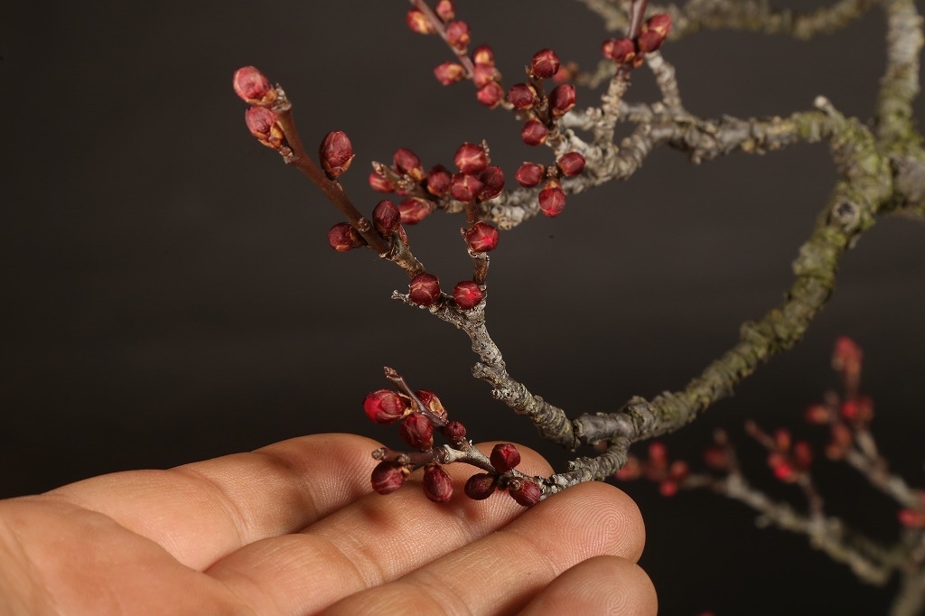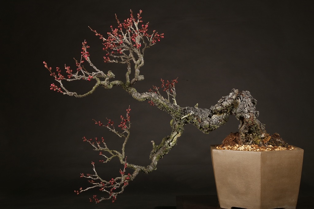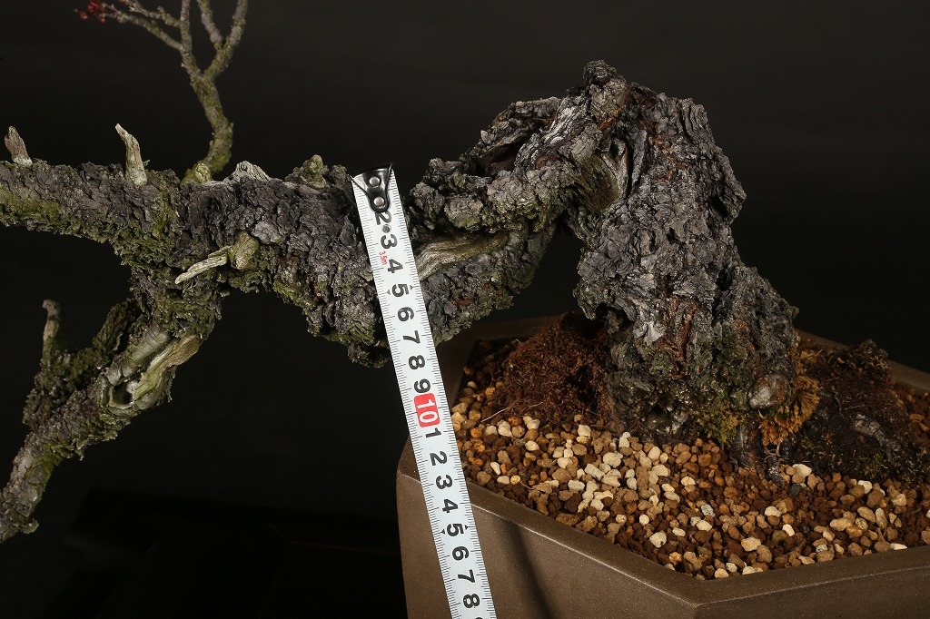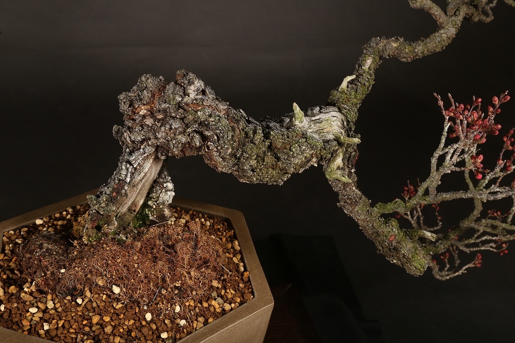 梅の“古感“の手本と言える鉢持込の古さから来る幹肌の素晴らしさ、半懸する樹姿の先には、禅語「枯木再花咲」のように、命の輪廻を謳うかの如く、可憐な蕾が花咲きを待っています。“梅はひと枝“と言われるように、繁茂する樹相ではなく、まるで墨絵で描かれたようなこのような樹が本歌と言えます。