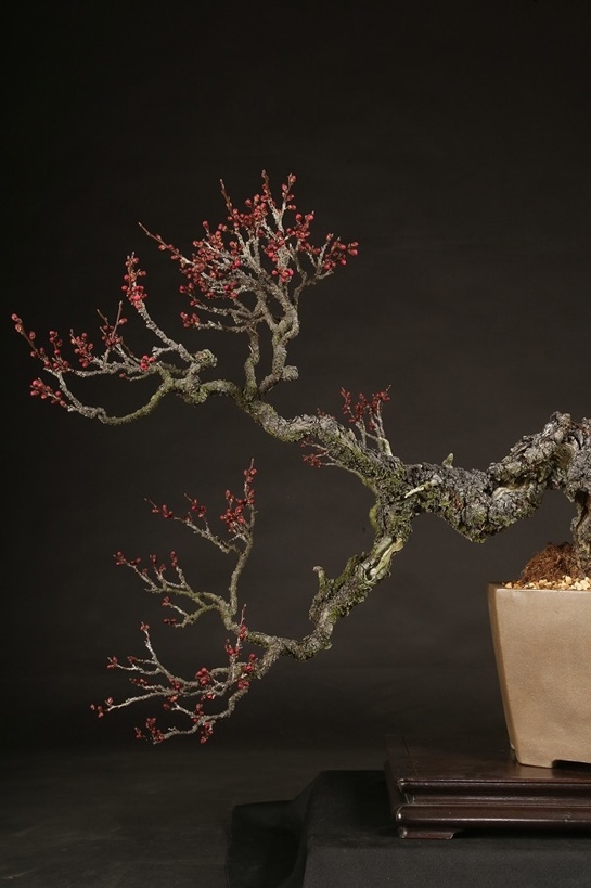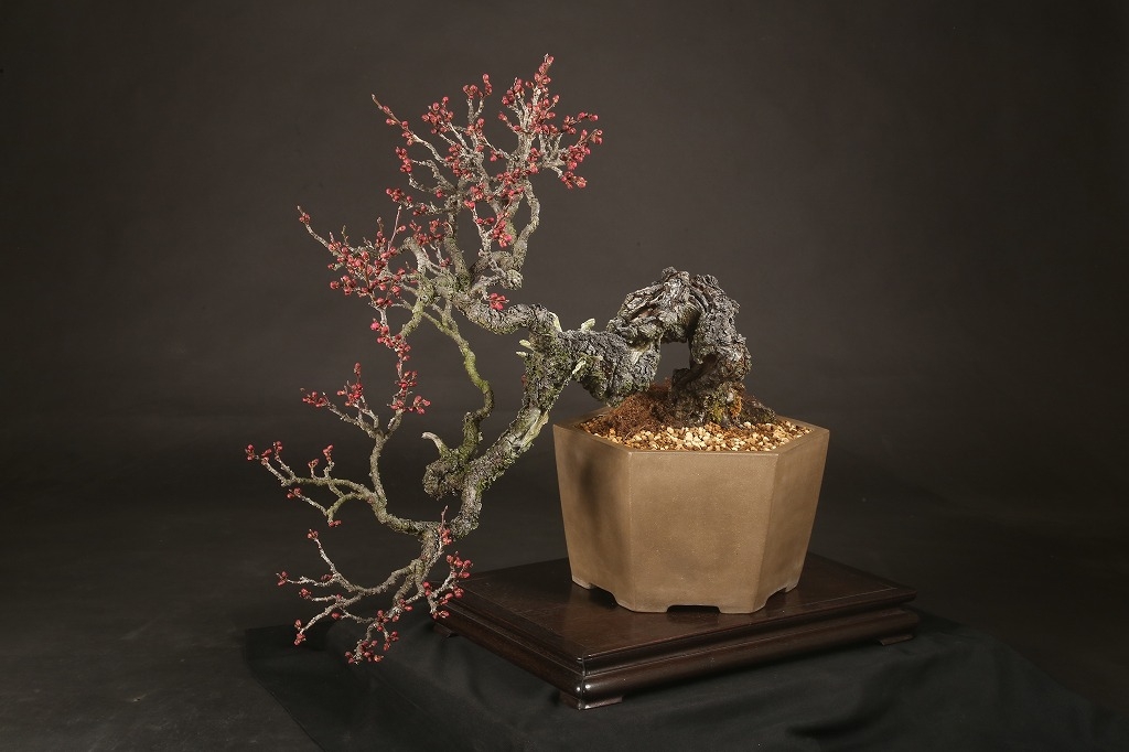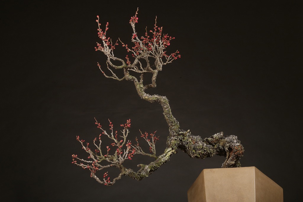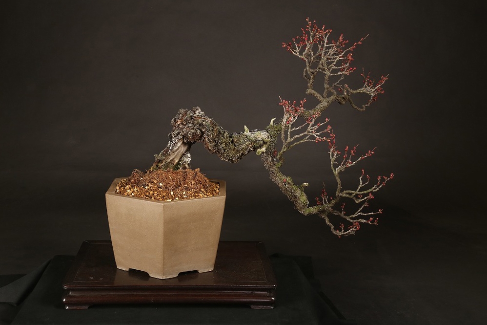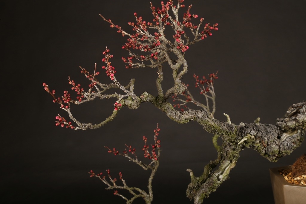 梅の“古感“の手本と言える鉢持込の古さから来る幹肌の素晴らしさ、半懸する樹姿の先には、禅語「枯木再花咲」のように、命の輪廻を謳うかの如く、可憐な蕾が花咲きを待っています。“梅はひと枝“と言われるように、繁茂する樹相ではなく、まるで墨絵で描かれたようなこのような樹が本歌と言えます。