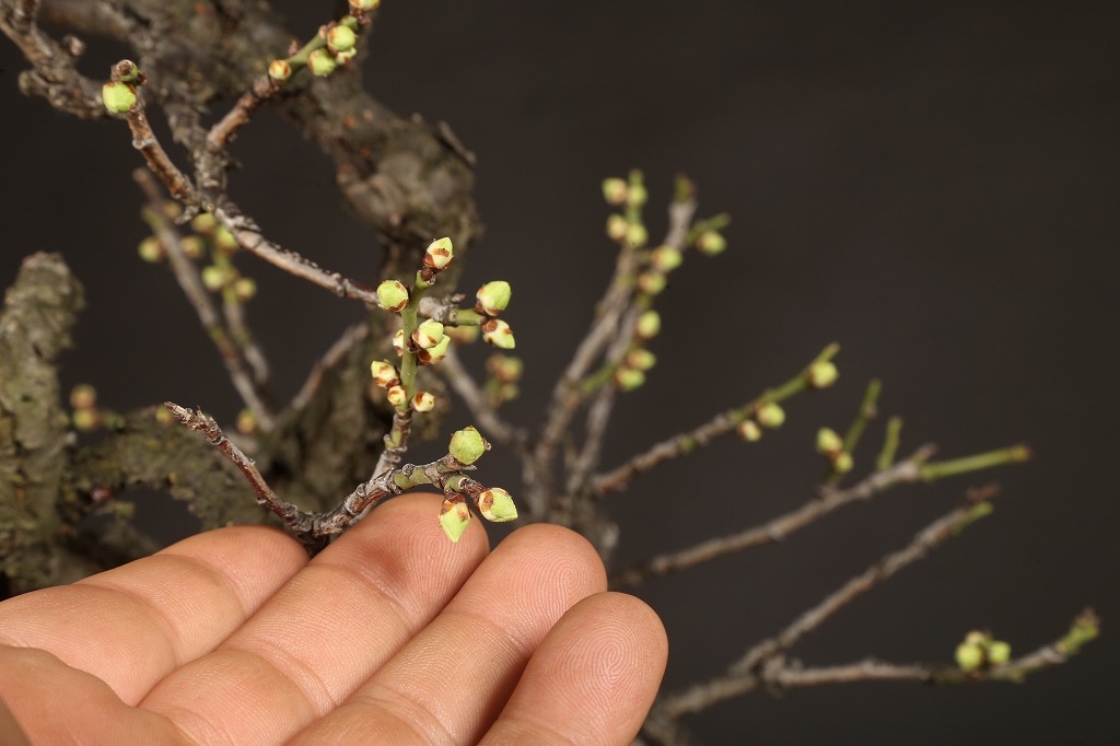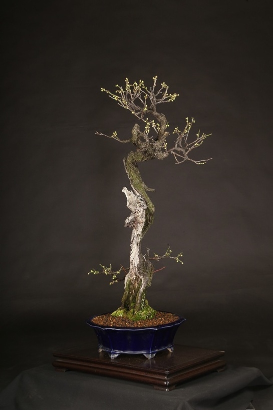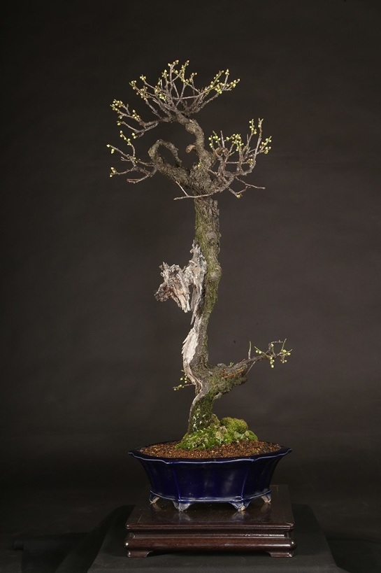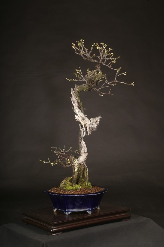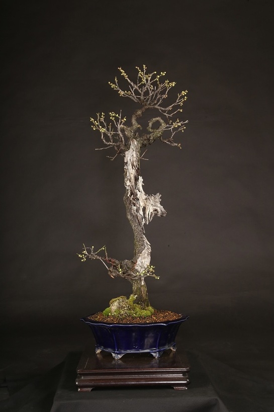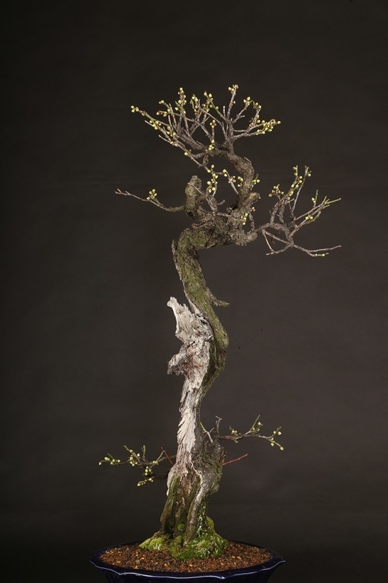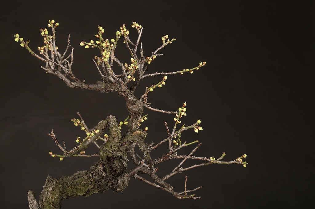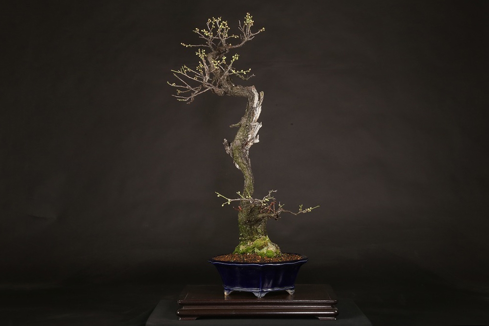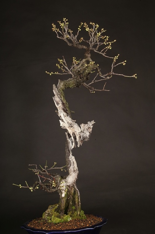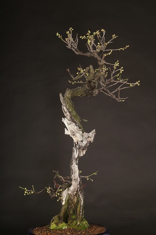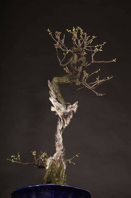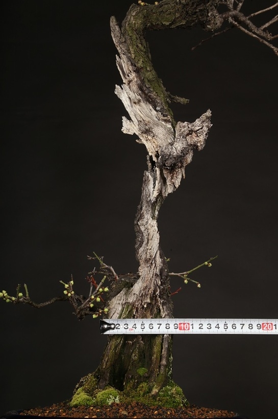 古画の掛軸の中から抜け出して来たような盆梅です。舎利幹を抱きながら、屹立するその姿は、文人風の野梅として絶品と言えます。厳冬期、古雅なる姿の中に咲く梅の花は、静謐の美の極み!必見の一樹です。