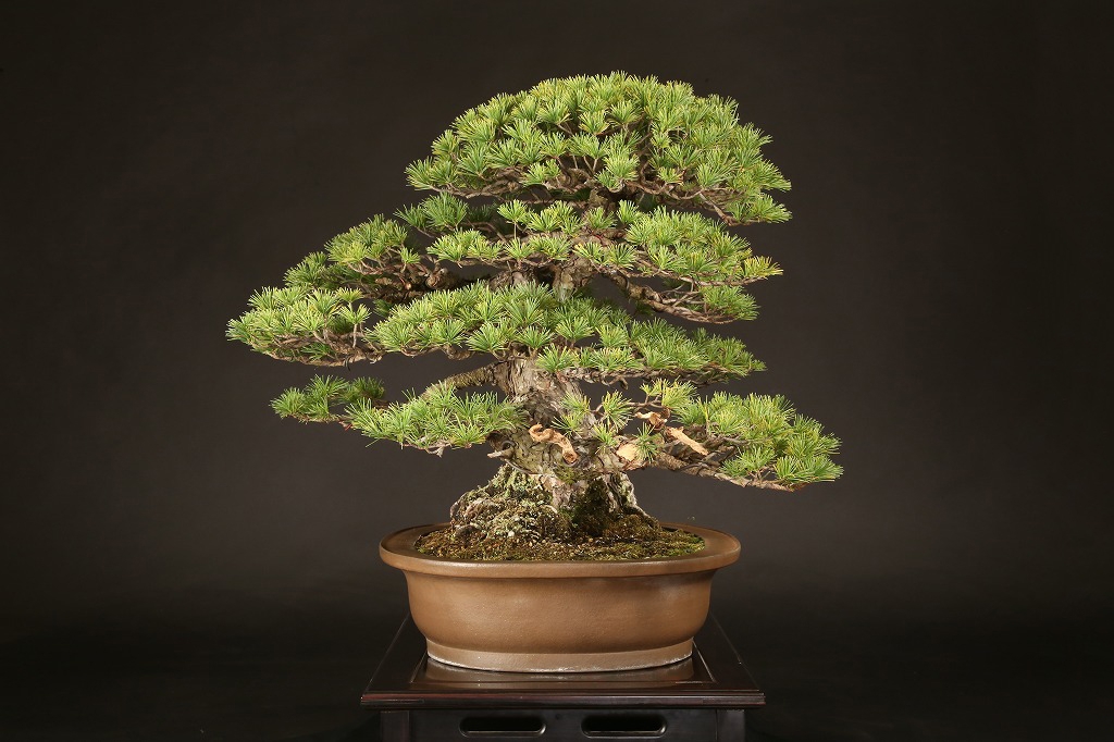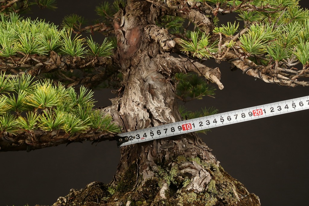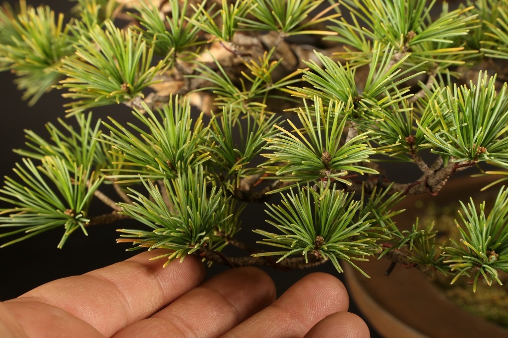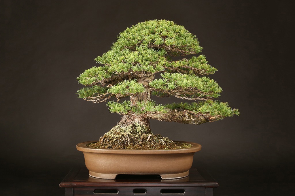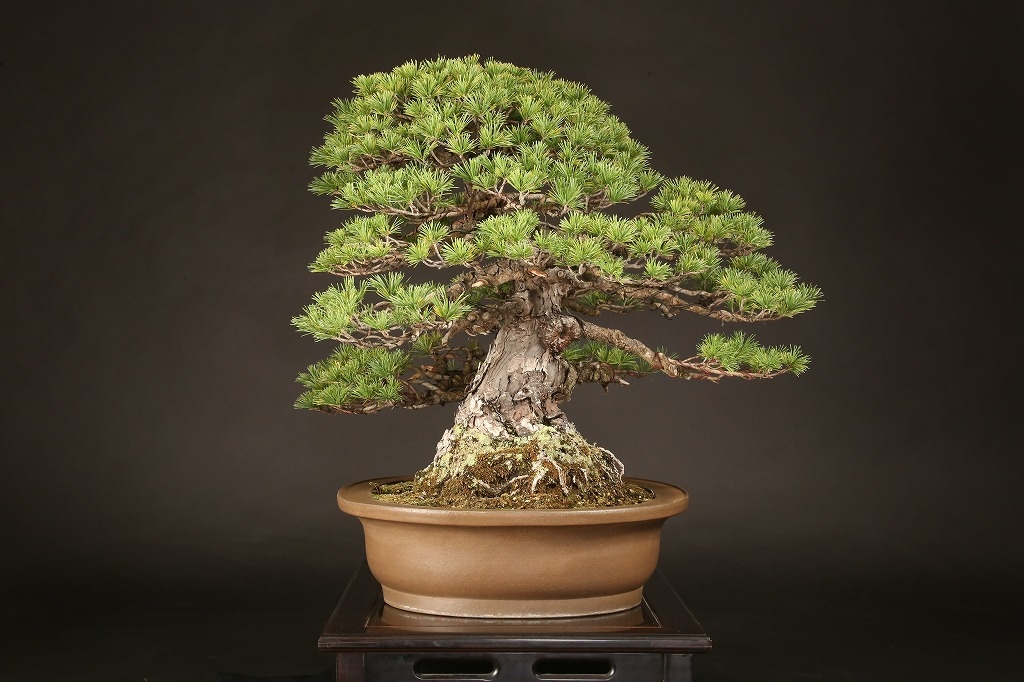広がりのある八方に張った根張り、緩やかに曲がった五葉松らしい幹模様。中型松柏盆栽の理想的な“挿し枝作り“の盆栽として、高い将来性を感じる逸材です。出品前に森山義彦師によって、挿し枝の切り詰めが行われました。葉性良く、5年10年後の名樹となった姿が楽しみな一樹です。