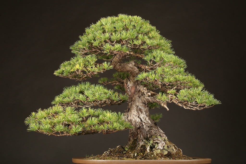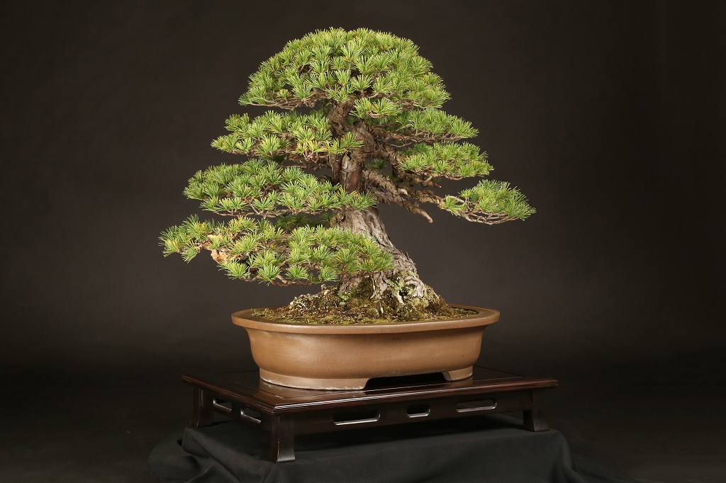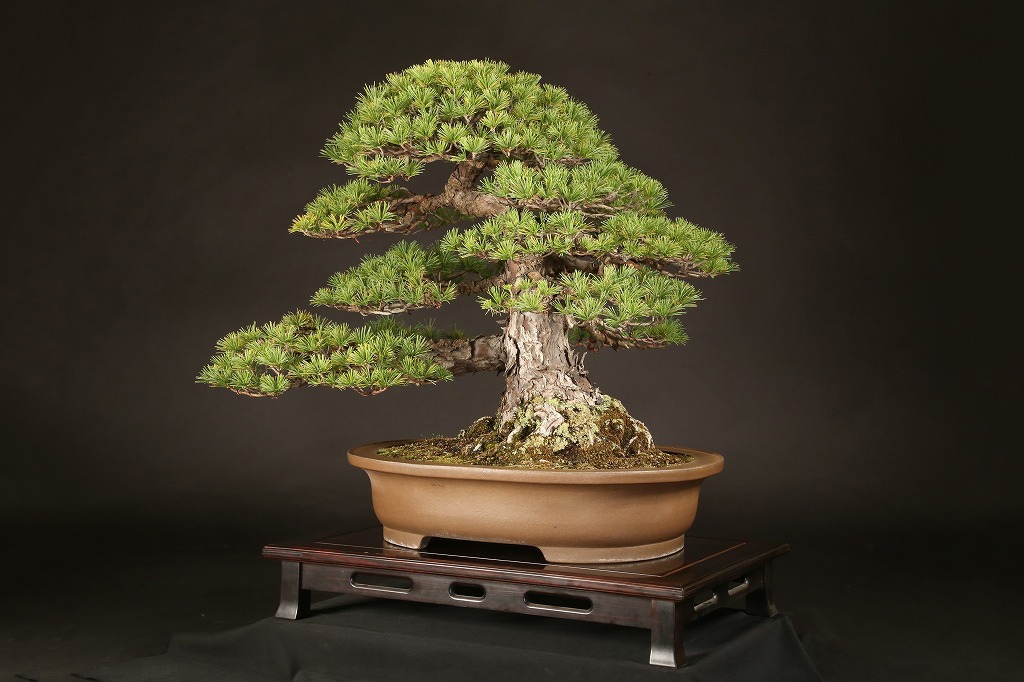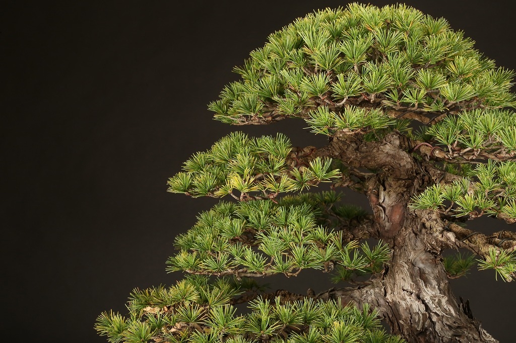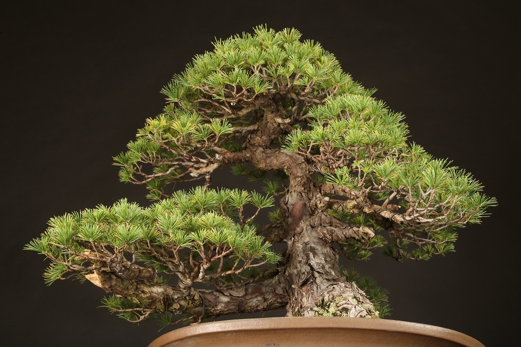 広がりのある八方に張った根張り、緩やかに曲がった五葉松らしい幹模様。中型松柏盆栽の理想的な“挿し枝作り“の盆栽として、高い将来性を感じる逸材です。出品前に森山義彦師によって、挿し枝の切り詰めが行われました。葉性良く、5年10年後の名樹となった姿が楽しみな一樹です。