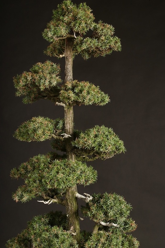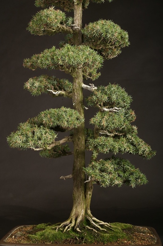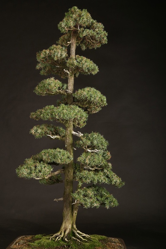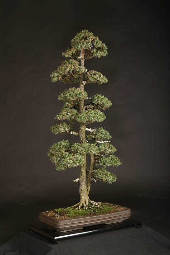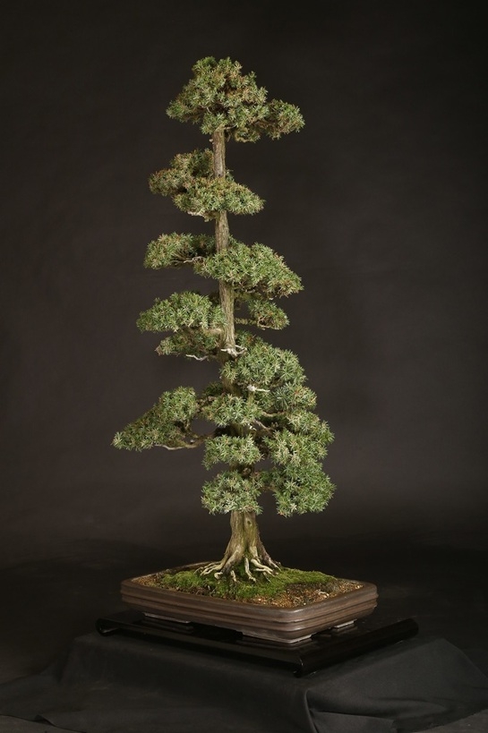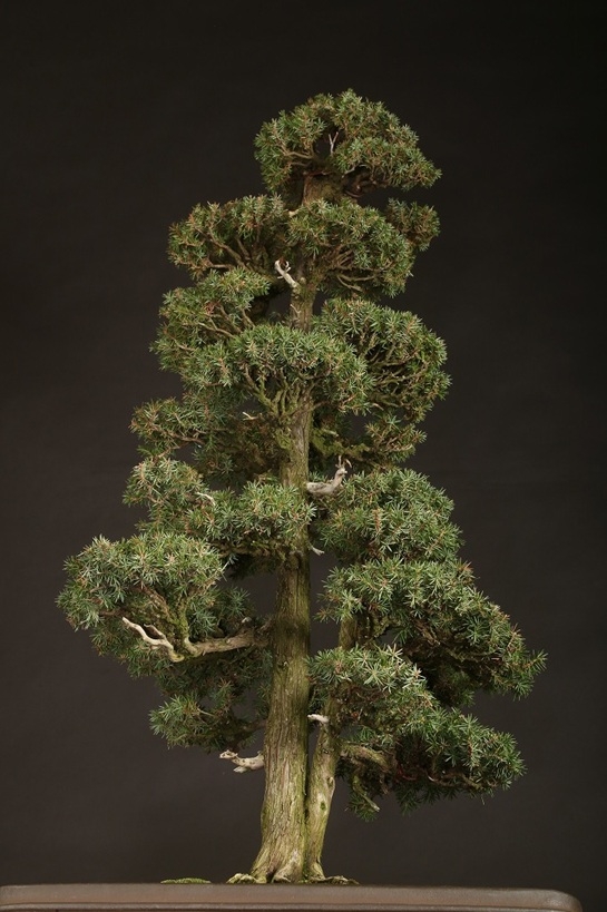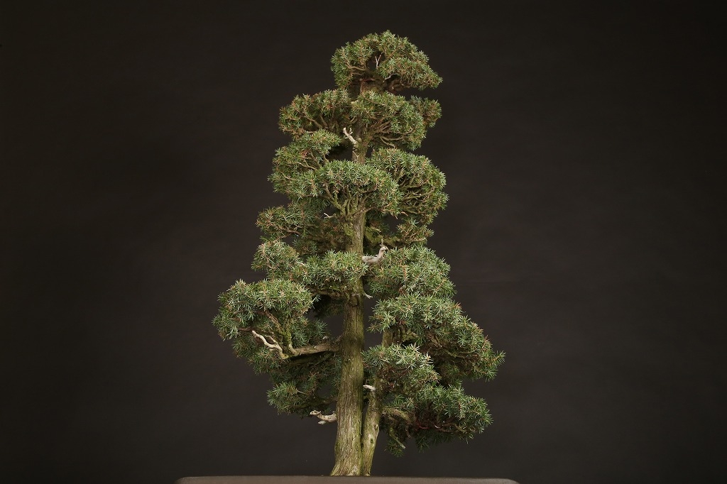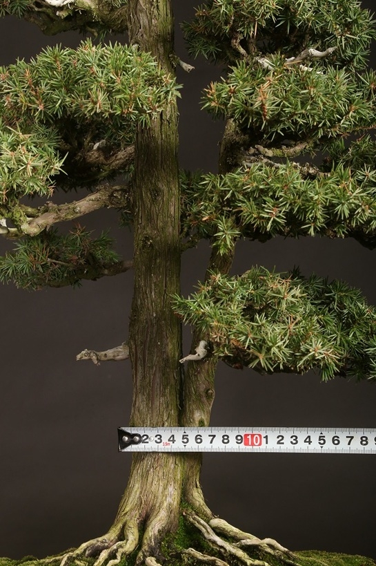 信州を代表する大家愛好家が長く所蔵されていた賓作。屹立する双幹体の樹相は、戦前から受け継がれた座敷飾りにも映える姿は、目利き愛好家が丹精を重ねた結果。激減する杜松盆栽のある意味の完成形と言えます。