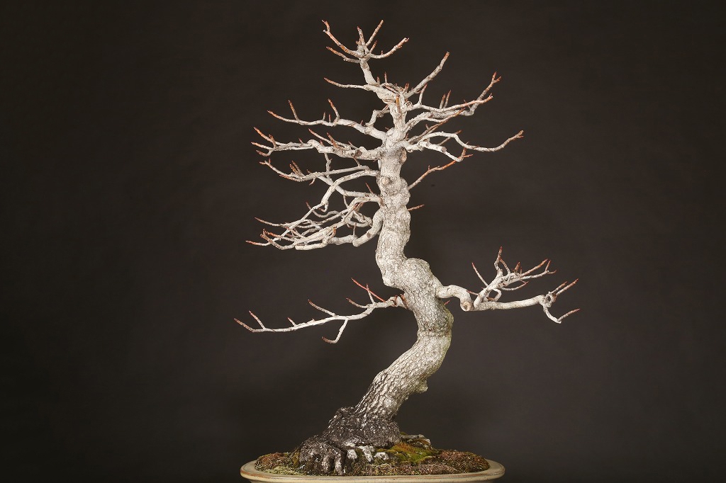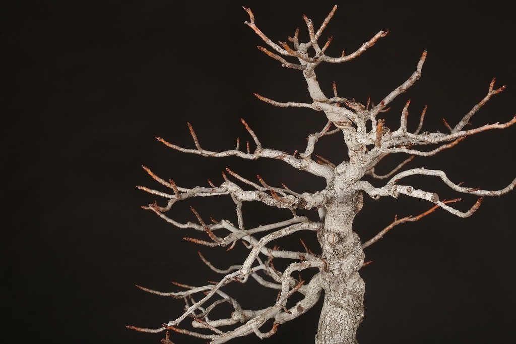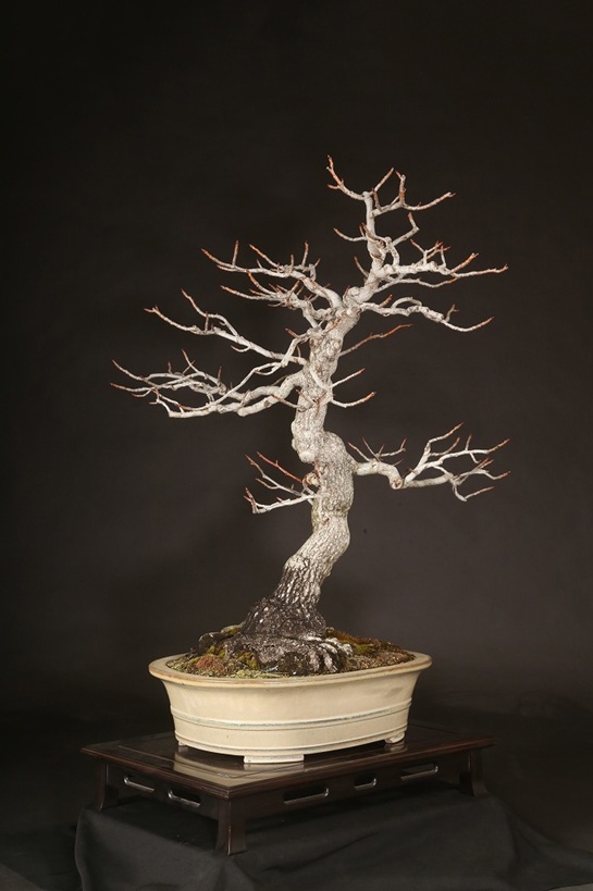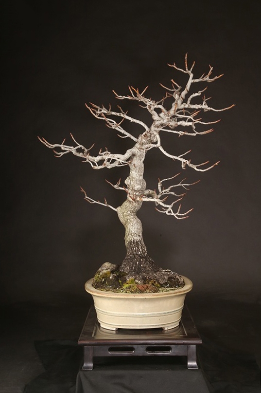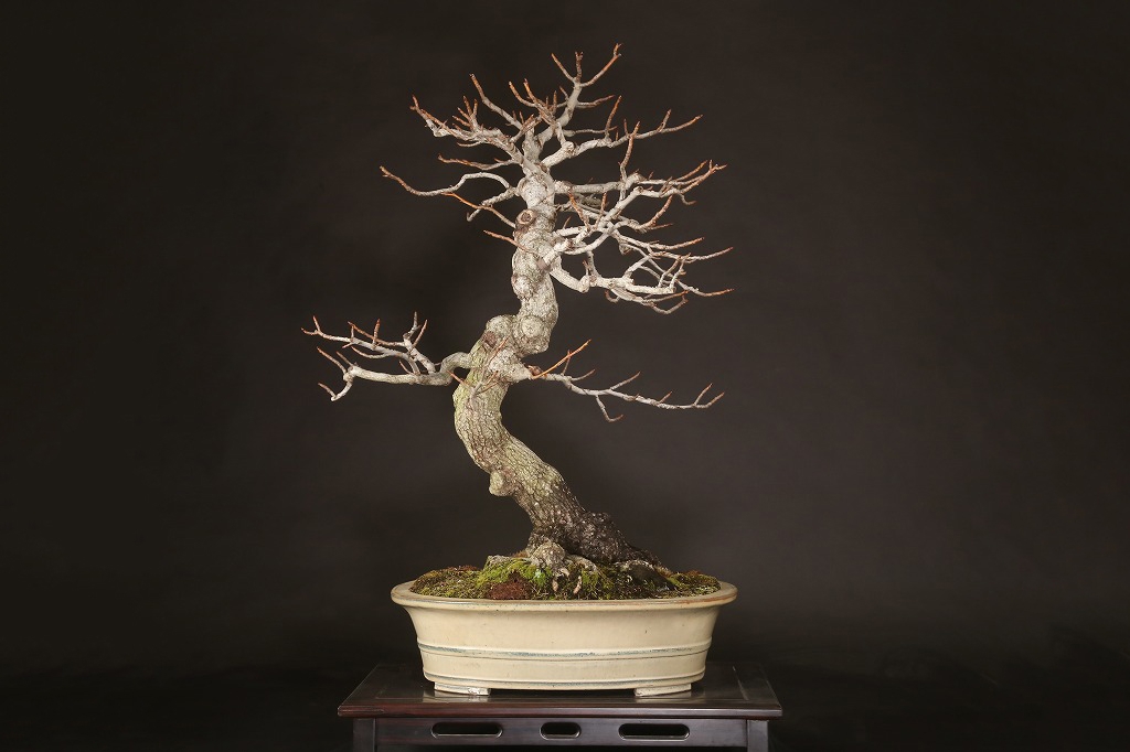 関西を代表する八十路を超えた古老大家が長年愛培された稀少樹種です。栗のイガの様な実姿を持つことからこの名が付きましたが、葉はカナダ国旗に似た姿、特に紅葉の鮮やかさは、雑木盆栽の中でも突出した美しさと言えます。穏やかな模様姿は、ここからの作出で銘樹になる基本を備えた逸材の証しです。