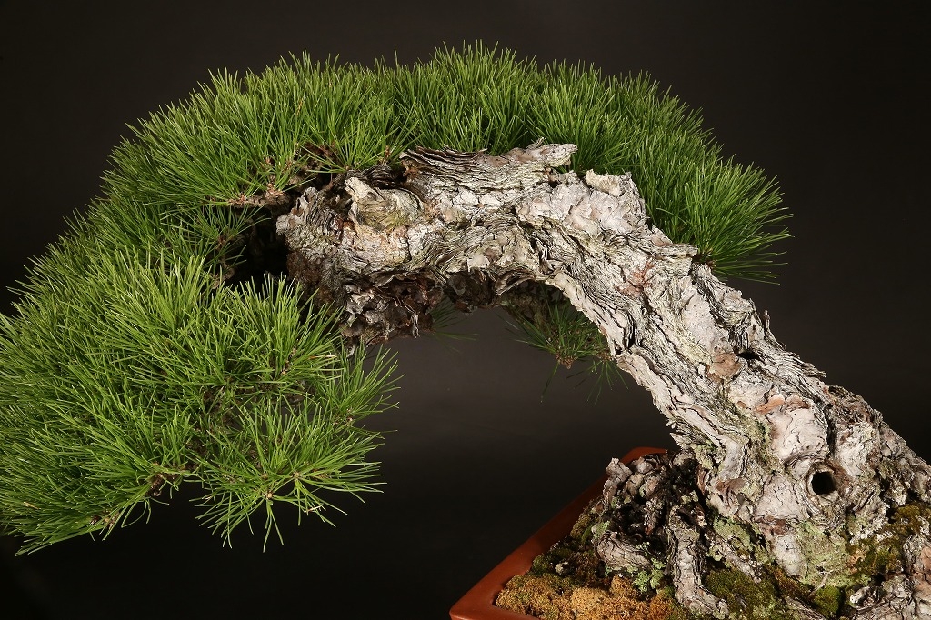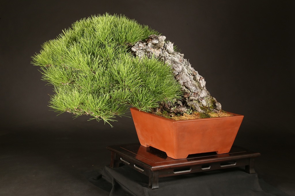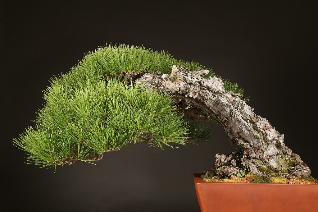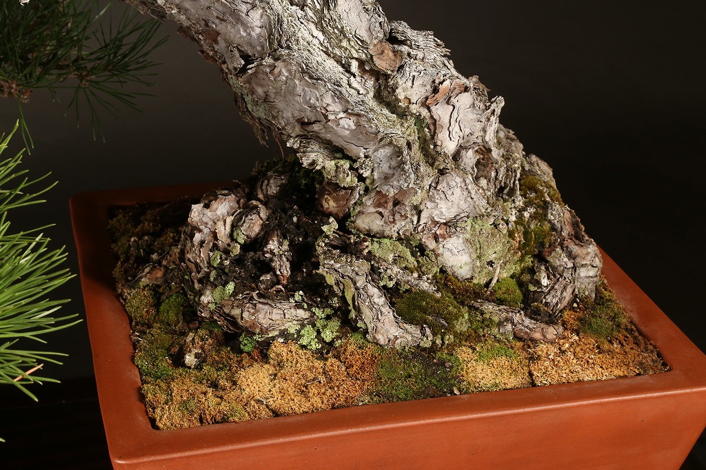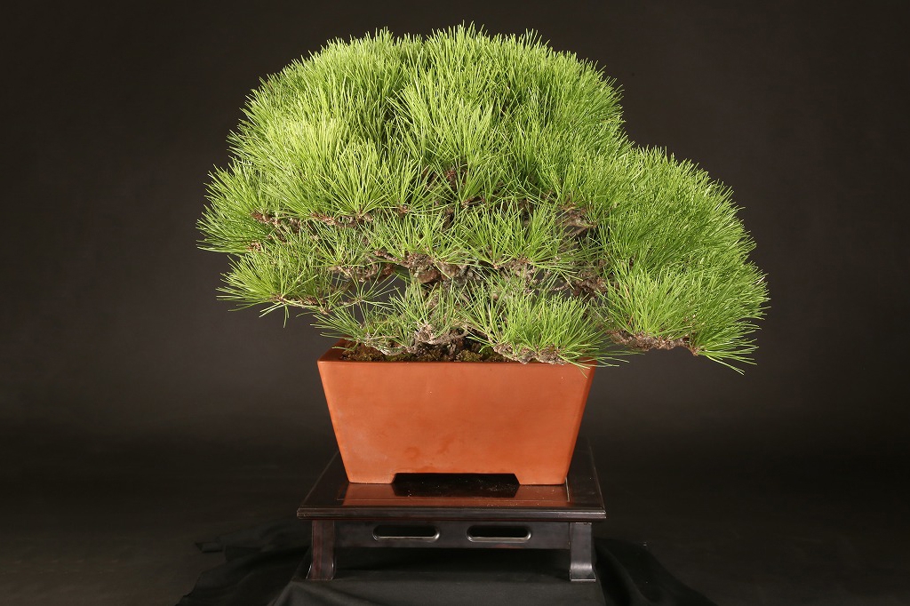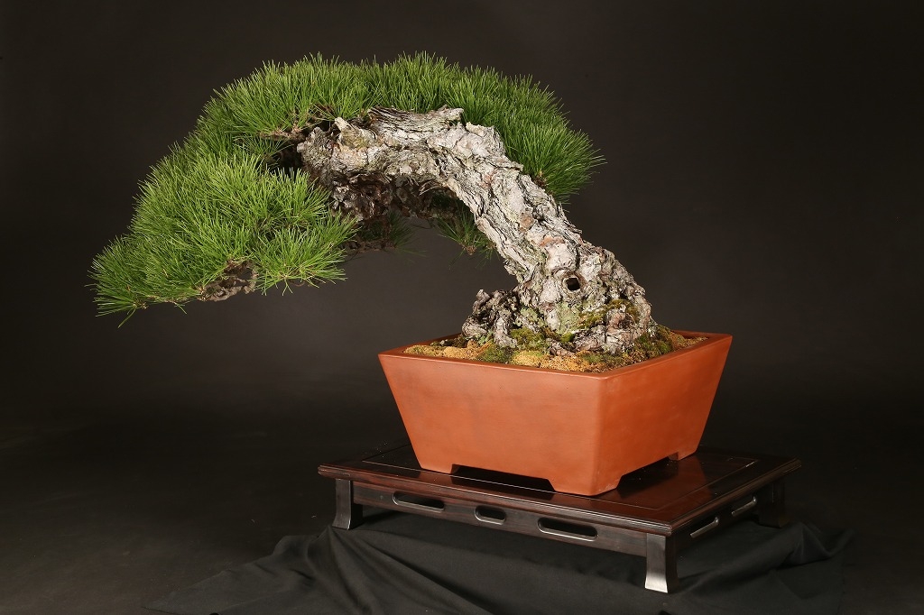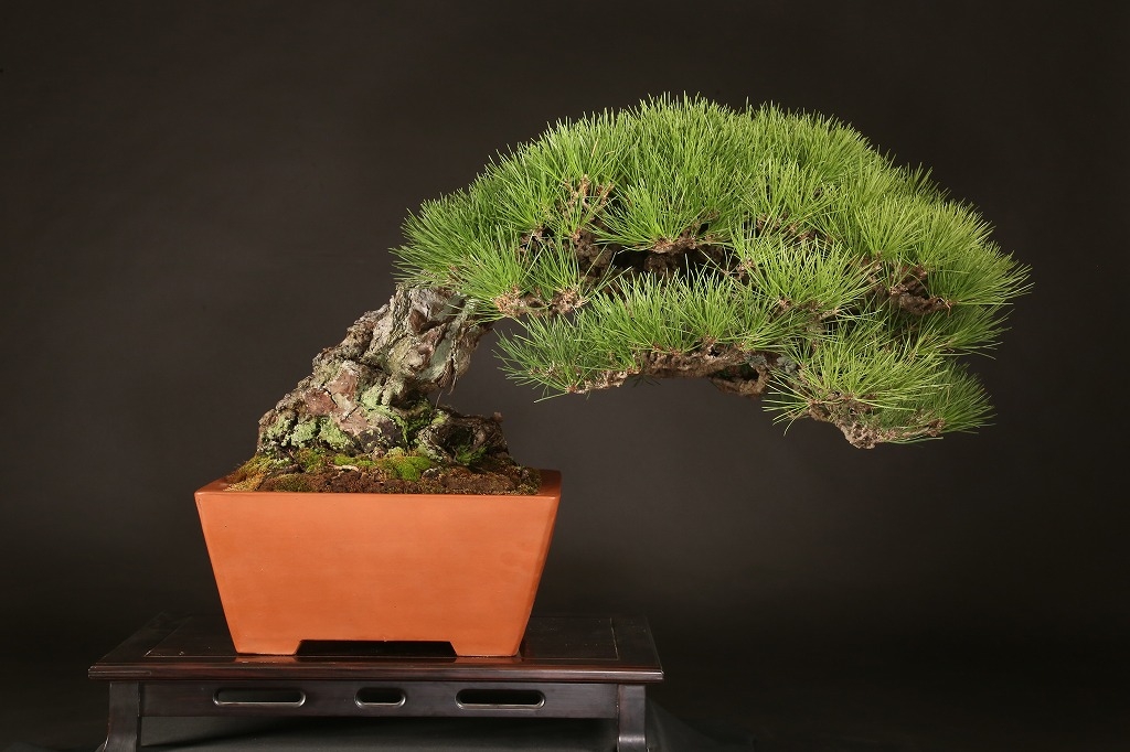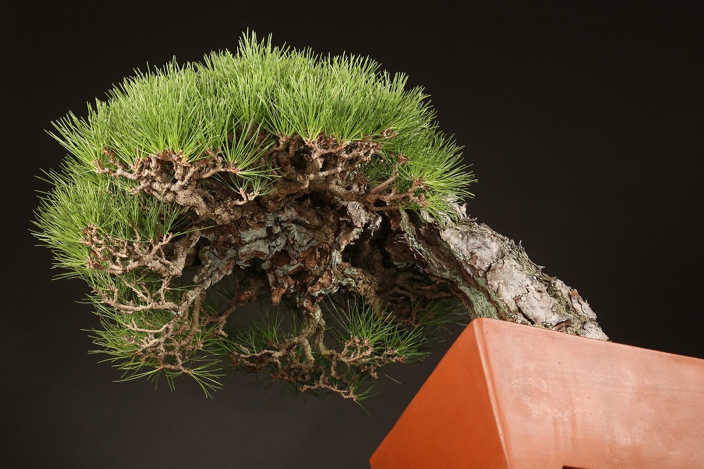 三河黒松の“乗り出し“半懸崖の名樹です。鉢持込み古く、幹肌の荒ぶれた風は、黒松盆栽の理想と言えます。長く九州の愛好家の蔵樹だったものを、昨年入手して、この正方に入れ替えました。展覧会など未公開の樹、ここからの仕上げ作出(枝々に更に“間“を作って)する事で、次代の名品となる逸品です。端的だからこそ、黒松としてのごまかしのない力強さを表現できる樹です。