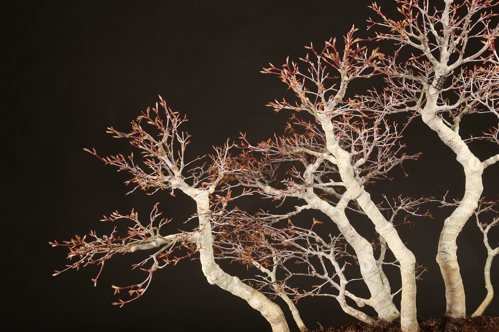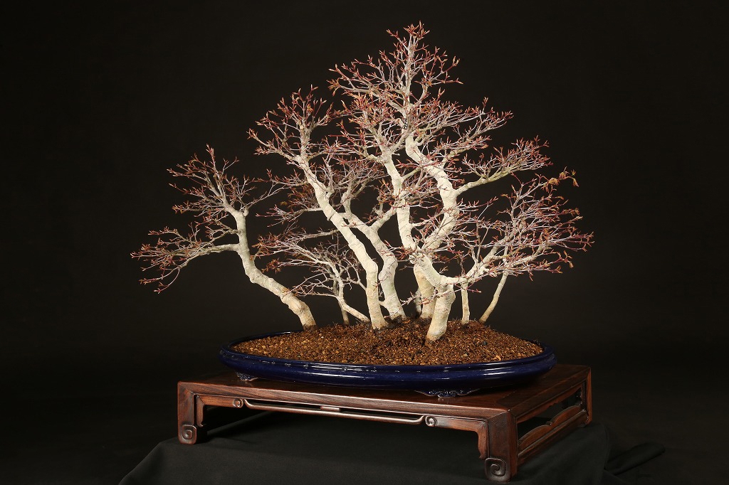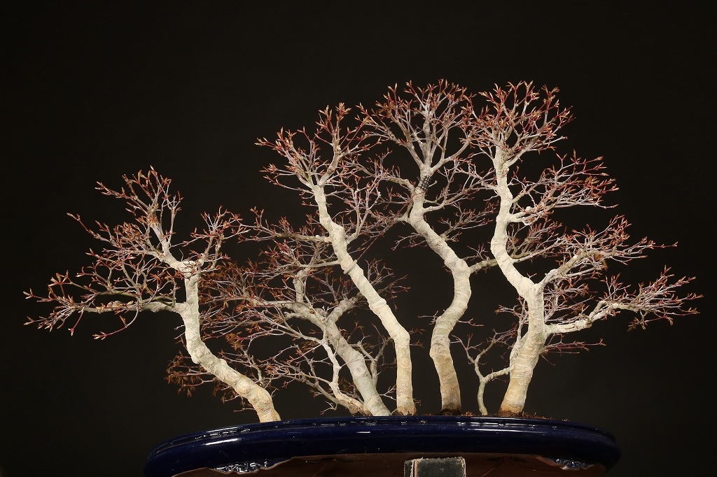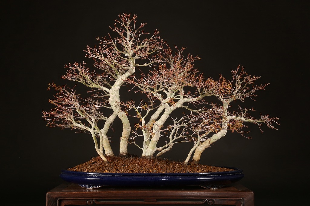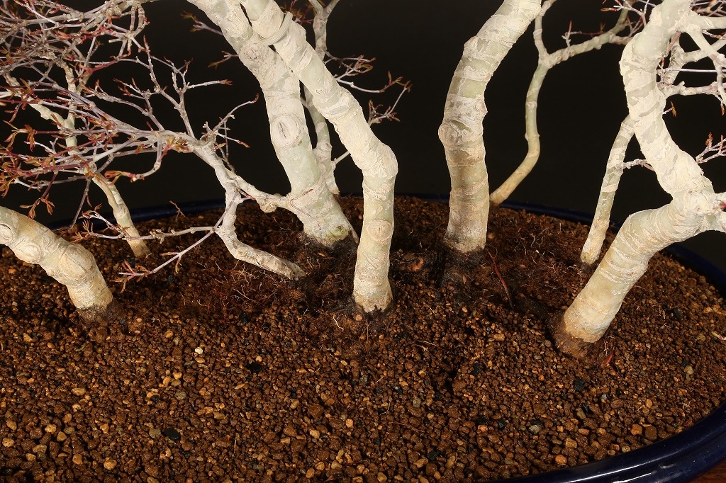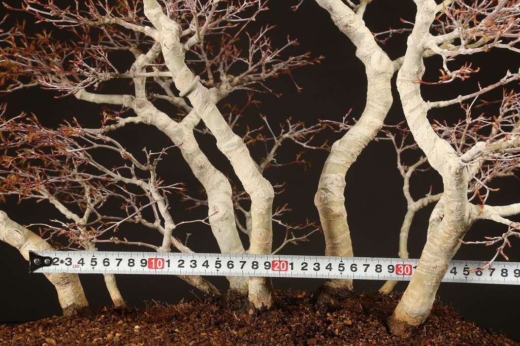 極小の“もみじ手“の葉性、芽吹きの良さと細やかさ、葉が成長期でも“大葉“にならず、作りやすさと培養の容易さで群を抜くもみじの新種「行姫」は、那須地方で“那須五葉松“の純質素材の育成に努められている印南五蓉園氏が、偶然一本の樹を発見した事から生まれました。この年数のものは印南氏の手元しかなく、小店との交流によって、特別に割愛を得たものです。譲り受けた行姫の寄植えを、もう一度根分けをして、将来の名樹となるように間を取った植え付けに仕上げたものです。もう市場にはない行姫のこの年数の大型寄植えです。